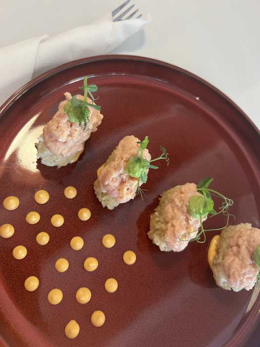 While sipping my matcha latte, another barista came over to ask what I wanted to order for my entrée. I wavered between the roasted beet and goat cheese salad and the chicken pesto panini. Still, I’m a total sucker for crispy tuna bites—the viral squares of crisp sushi rice topped with tuna tartare, avocado, scallion, sesame, and spicy aioli sauce. My entrée arrived within a few minutes. First, it was stunning to look at: golden squares of crispy rice topped with pink-hued tuna tartare, featuring pops of green from the avocado and scallion, and small dots of spicy aioli. It was the perfect combination of warm, crispy rice, cool, fresh tuna, creamy avocado, and a subtle kick of spice from the sauce. The serving came with four pieces, perfect for one person as an entrée or shared as an appetizer for two. Needless to say, I cleaned my plate. My eyes almost got the better of me when I glanced at another table and saw—and smelled—the truffle Parmesan fries. Those are definitely next on my list!