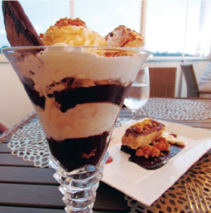 We decided to share a dessert and ordered A Snickers Bar, fudge cake, peanut butter mousse, caramel, ganache and hazelnut crunch; and decaf coffee, which was hot and strong. To our surprise, Gus returned with an additional dessert, the S’more Sundae, vanilla ice cream, hot fudge, marshmallow and a chocolate covered graham cracker. I cannot resist ice cream so I dove right into the sundae with its marshmallow swirls; it was so good! By the time we “picked” at both desserts, they were just about gone.Other dessert selections are the Lakehouse Black Magic, Summer Peach & Blueberry Crisp and a selection of gelato and sorbet, to name but a few. There are also dessert cocktails and a choice of whiskeys, brandys and cognacs.I cannot say enough about the service or the staff, who were all friendly, helpful and efficient. Several tables were turned over while we enjoyed our meal, and that was just on the outside deck. When we left, the dining room inside was packed and the Tap Room, which offers a separate bar menu (also available to us on the deck), had many customers as well. Eileen was on the floor walking from table to table talking with everyone, an unusual sight in many restaurants.