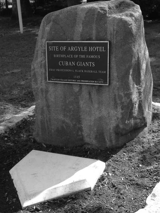 The site of Argyle Hotel is a popular park that includes a baseball field for the Babylon High School across the street. Many visitors do not know of the park’s history, and many others do not notice a section by Railroad Avenue that encapsulates the significance of its history. Next to a large boulder is a home plate, and tethered to the boulder reads a plaque “Site of Argyle Hotel, Birthplace of the Famous Cuban Giants. First professional Black baseball team 1885.”