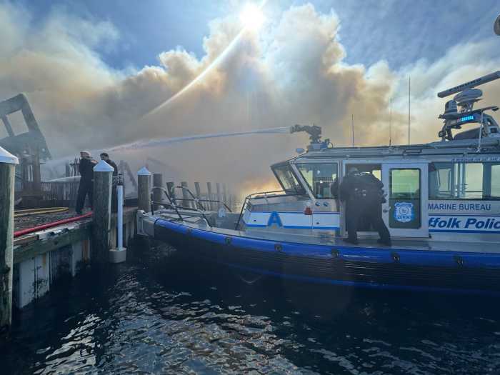 It is believed that the original combustion point broke out in a storage shed on the property of 165 Bay Walk, which sits on the western residential portion of Ocean Beach, crossing at Wilmot Road. The rapidly moving blaze led to the collapse of the main house at 165 Bay Walk, necessitating that the Ocean Beach Fire Department request mutual aid from the neighboring fire departments of Fair Harbor, Ocean Beach Park, and Point o’Woods. Mainland departments also responded, coming to the scene with fire boats, drawing water from the Great South Bay to contain the smoky inferno, including Bay Shore and East Islip fire departments, as well as support from the Suffolk County Police Department (SCPD), with the Marine Bureau dispatching vessels Marine Alpha, Juliette, Marine 1, and Marine 3 utilizing their on-board fire apparatus to douse the flames. Meanwhile, SCPD Aviation Section officers responded and alerted the officers and firefighters to potential hot spots to also stop the spread.